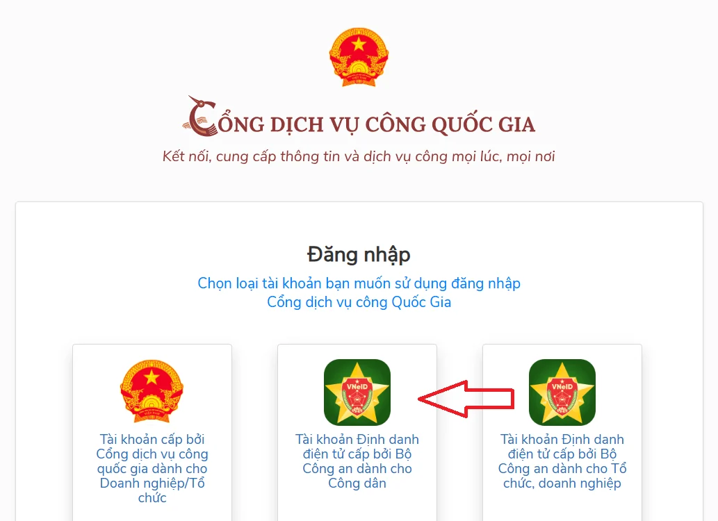 Bước 2: Chọn Đăng nhập → chọn “Tài khoản định danh điện tử cấp bởi Bộ Công an” (VNeID).