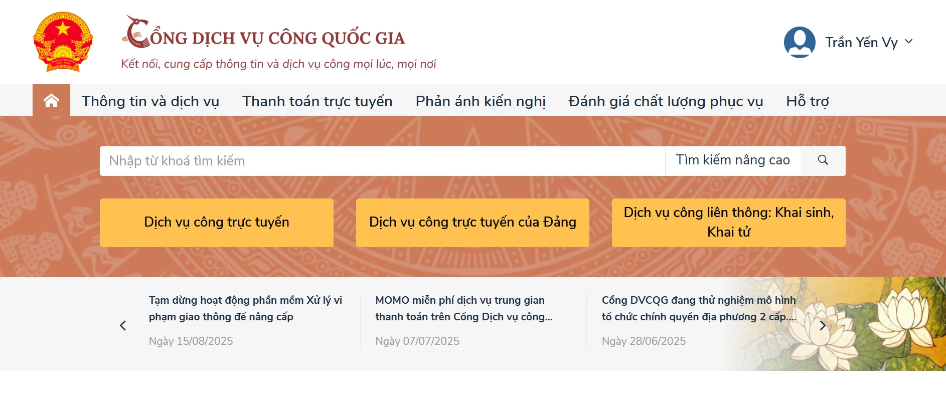 Bước 4: Sau khi đăng nhập thành công, nhập thủ tục hành chính cần thực hiện tại thanh tìm kiếm.