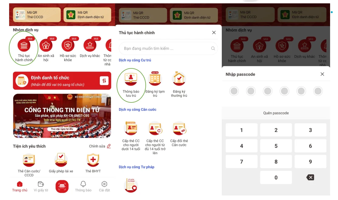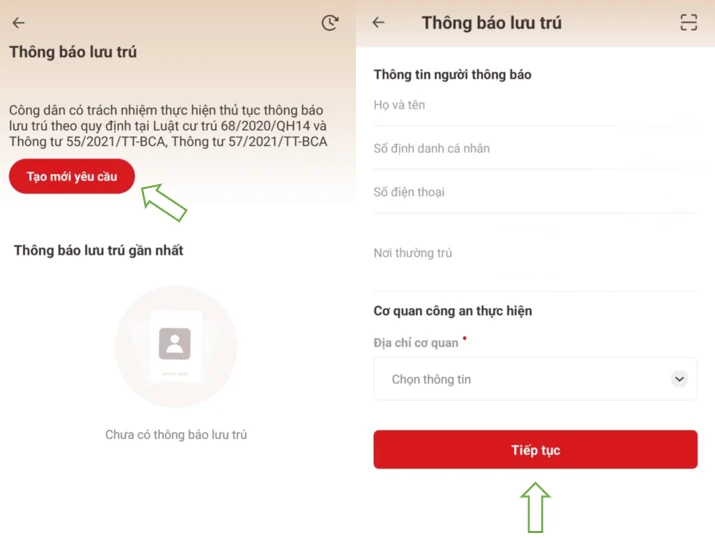 - Mở app → Thủ tục hành chính → Thông báo lưu trú → Tạo mới → Điền thông tin, đính kèm giấy tờ → Gửi yêu cầu.