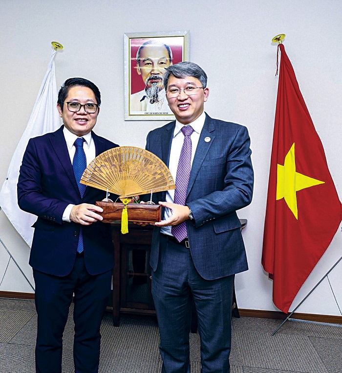 Bí thư Tỉnh ủy Nguyễn Hải Ninh (bên phải) tặng quà lưu niệm cho Tổng Lãnh sự Việt Nam tại Osaka Ngô Trịnh Hà